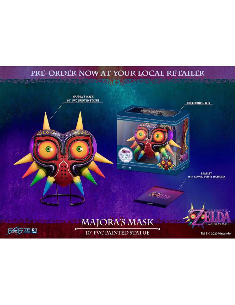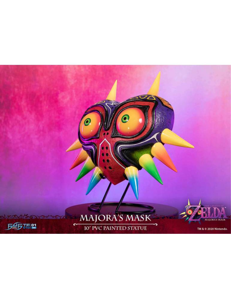 FIRST 4 FIGURES presenta esta réplica de la máscara de Majora. Hecha en Pvc, la Máscara mide 25 cm, y debido a su menor escala, ahora podemos hacer que esta pieza se pueda montar en la pared a través de una ranura en la parte posterior. Pero si prefiere exhibir su colección en los estantes, la edición estándar viene con un soporte de exhibición en el que puede montar la estatua. La edición estándar no tiene función de luces LED. Se incluye un folleto F4F con 500 puntos de recompensa F4F.