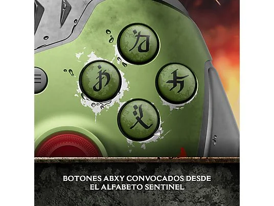 Levanta tu escudo sierra con el gatillo naranja izquierdo para bloquear tu intención letal. Apunta con el siniestro joystick rojo y accede al poder antiguo con los botones ABXY verdes invocados desde el alfabeto de los Centinelas. Además, conecta cualquier auricular compatible en el conector de audio de 3,5 mm.