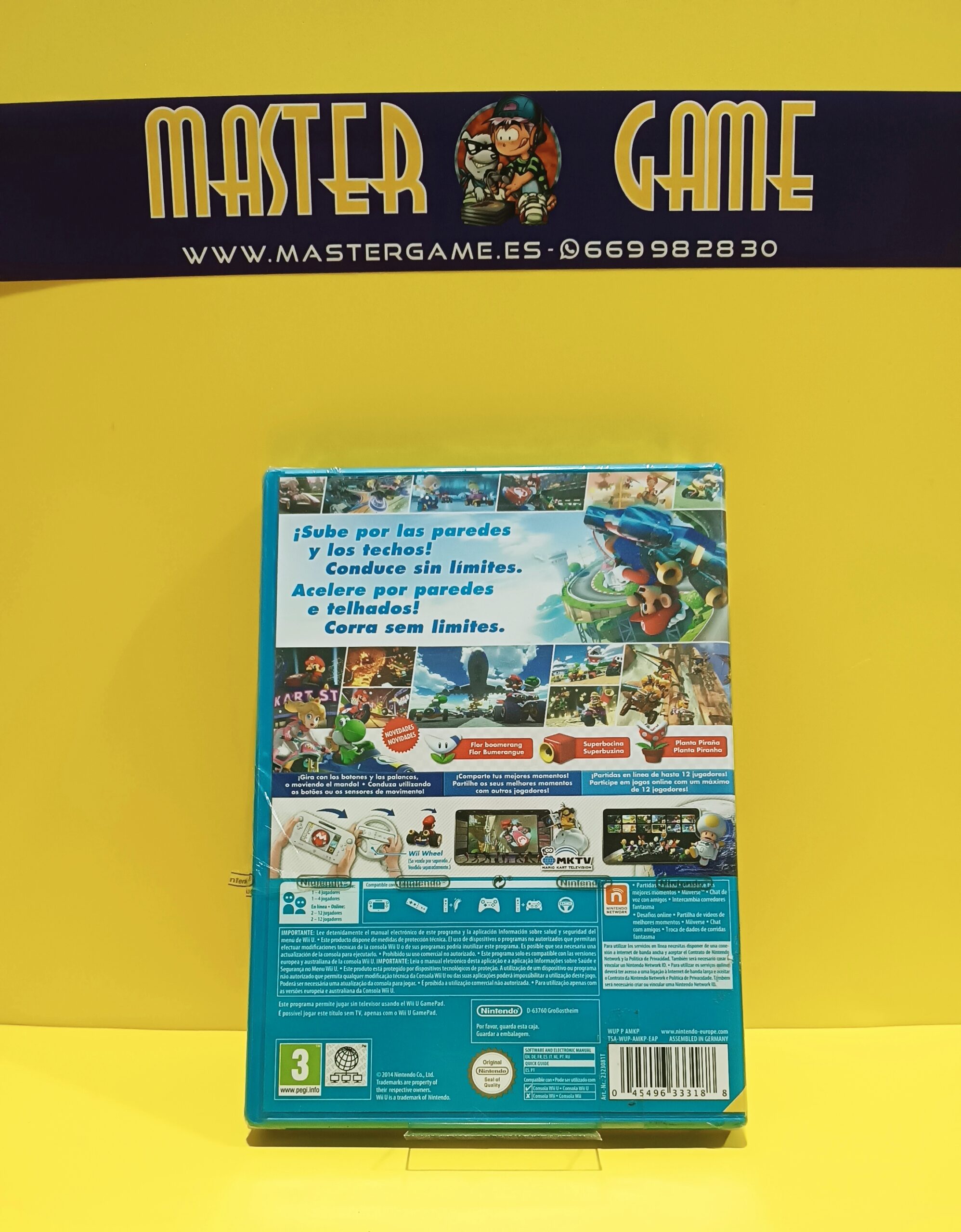 Pon la diversión patas arriba con Mario Kart 8, solo para Wii U. Utiliza el modo antigravedad para circular de todas las maneras posibles en increíbles circuitos y compite contra otros jugadores, ¡sin importar si están en el salón de tu casa o al otro lado del planeta! Pasa sobre los paneles azules antigravedad para darle más interés a la carrera y circular por cataratas, fachadas de edificios y mucho más. Las reglas de la carretera cambian en el modo antigravedad: tropezar con los rivales ahora te proporcionará un choque con acelerón. Gracias a la antigravedad, los planeadores y la acción submarina en 32 circuitos clásicos y nuevos, toda superficie puede vérselas con las ruedas de tu bólido. Además de los clásicos karts y las motos, podrás llevarte al asfalto un nuevo tipo de vehículo, ¡el quad de cuatro ruedas! Escoge neumáticos, carrocería y planeador para crear el vehículo perfecto: desde la bala más veloz con la aceleración ultrasónica hasta el que te ofrece la conducción más cómoda. E igual que hay un vehículo para cada tipo de jugador, también hay un mando para todos los gustos: controla tu automóvil con el Wii U GamePad, el mando Pro de Wii U, la Wii Wheel con el mando de Wii, el mando de Wii con el Nunchuk o el mando clásico Pro. Compite con rivales en cualquier lugar del mundo en variedad de modos. Reúne a cuatro amigos para jugar en el modo local multijugador* en Grand Prix, Carrera VS. o los modos de Batalla; y si te parece poca gente, únete a las competiciones online con hasta 12 pilotos. Participa en emocionantes torneos online o crea el tuyo propio: elige la hora de inicio y fin, marca las reglas a tu antojo y crea un código del torneo para que otros jugadores puedan unirse. Comparte tus mejores momentos en la pista y también tus derrotas más amargas a través de Mario Kart TV. Crea un carrusel de momentos destacados donde el mundo pueda admirar la destreza de tus movimientos al volante, los mejores objetos que has conseguido y momentos de grandiosa acción.